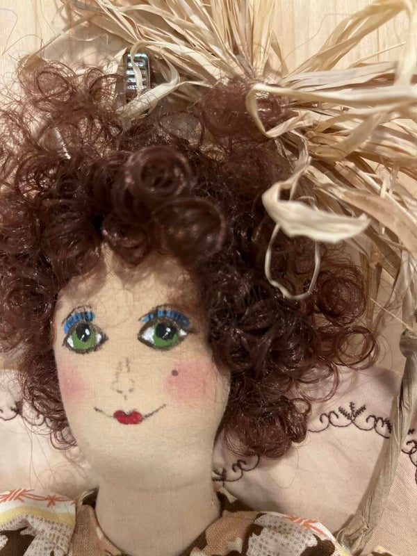 I have my cowboy dress on and embroidered wings; I'm handmade with handpainted face and I can hang on your wall in an arrangement that will bring your room to life or you can hang me on your door as a Welcome to your friends.